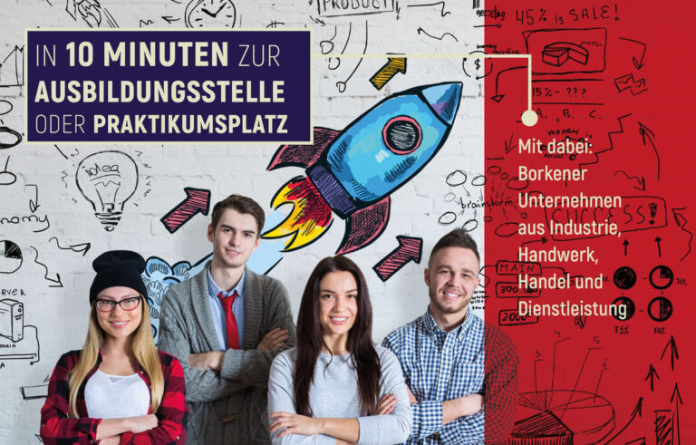 Borkener Azubi-Speed-Dating In nur zehn Minuten zum Ausbildungs- oder Praktikumsplatz! 18.06.2026 | 10:00 – 13:00 Uhr | Stadthalle Vennehof Unternehmen treffen auf eine Vielzahl von